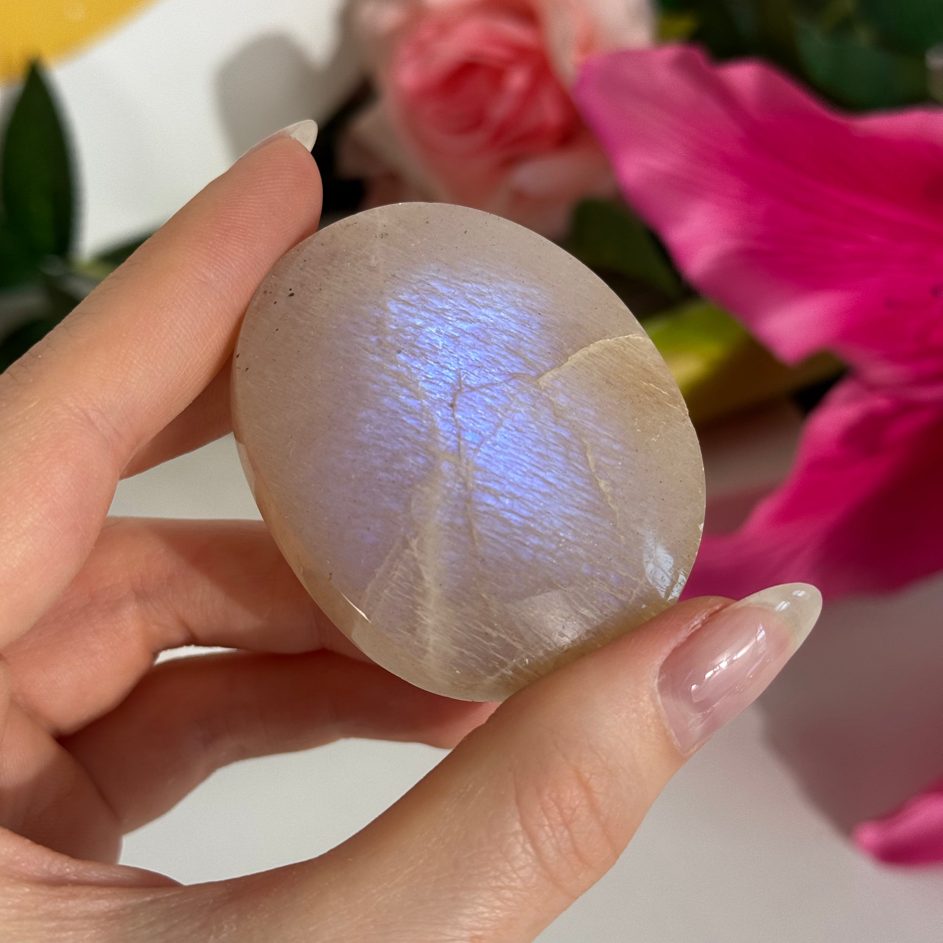 Der weiße Mondstein mit blauem Flash steht in der Spiritualität für Intuition, innere Klarheit und emotionale Balance. Sein schimmerndes Licht wird oft als Symbol für die Verbindung zur eigenen Weiblichkeit und zu den Zyklen des Lebens gesehen. Viele Menschen schätzen ihn in Momenten der Neuorientierung oder in Phasen, in denen sie lernen möchten, wieder mehr auf ihre innere Stimme zu hören. Der blaue Schimmer erinnert dabei daran, dass Eingebungen und Antworten oft leise erscheinen – wie kleine Lichtblitze im Dunkeln.