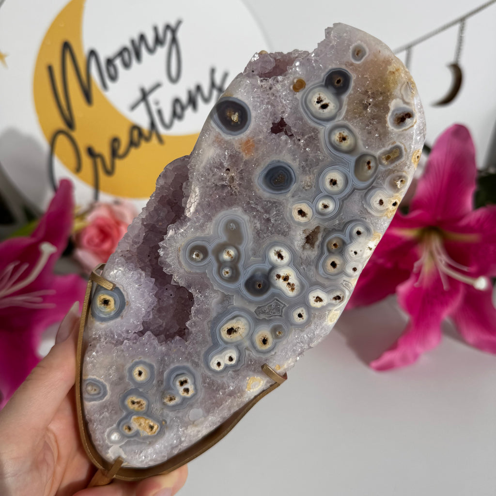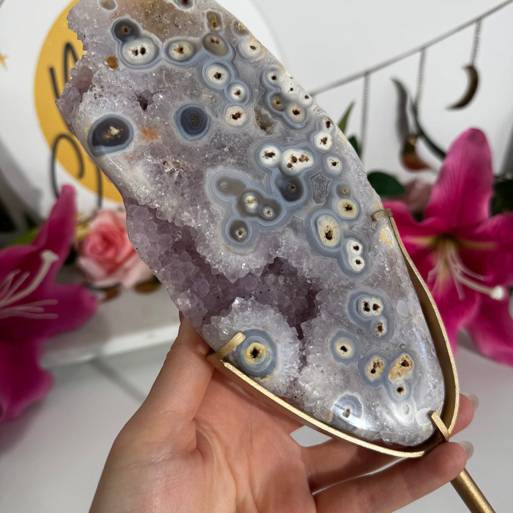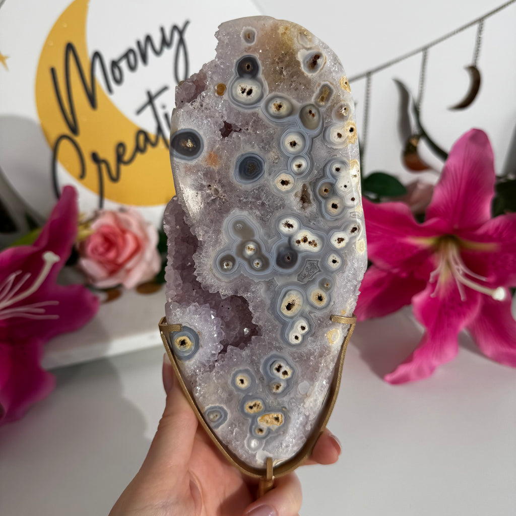 Die auffälligen runden Muster, die an Ozeanwellen oder kleine Planeten erinnern, sind sogenannte Achat-Augen. Sie entstehen, wenn sich Quarz und Chalcedon in konzentrischen Schichten um winzige Hohlräume ablagern – ein Prozess, der Millionen Jahre dauern kann. Das Innere füllt sich dann oft mit Amethystkristallen, die dem Stück seinen besonderen Glanz verleihen. Diese seltene Kombination aus Achat-Orbs und Amethystdruse macht dieses Stück zu einem faszinierenden Kunstwerk der Natur.