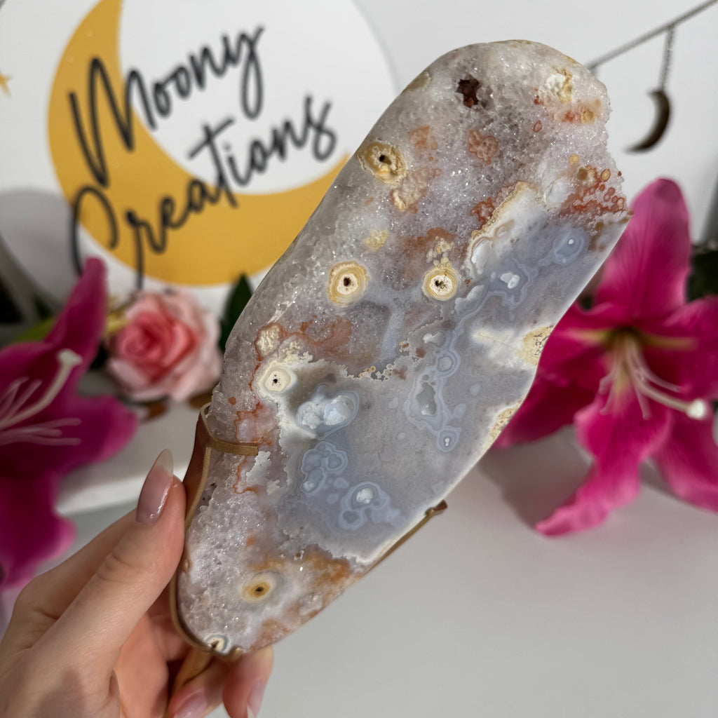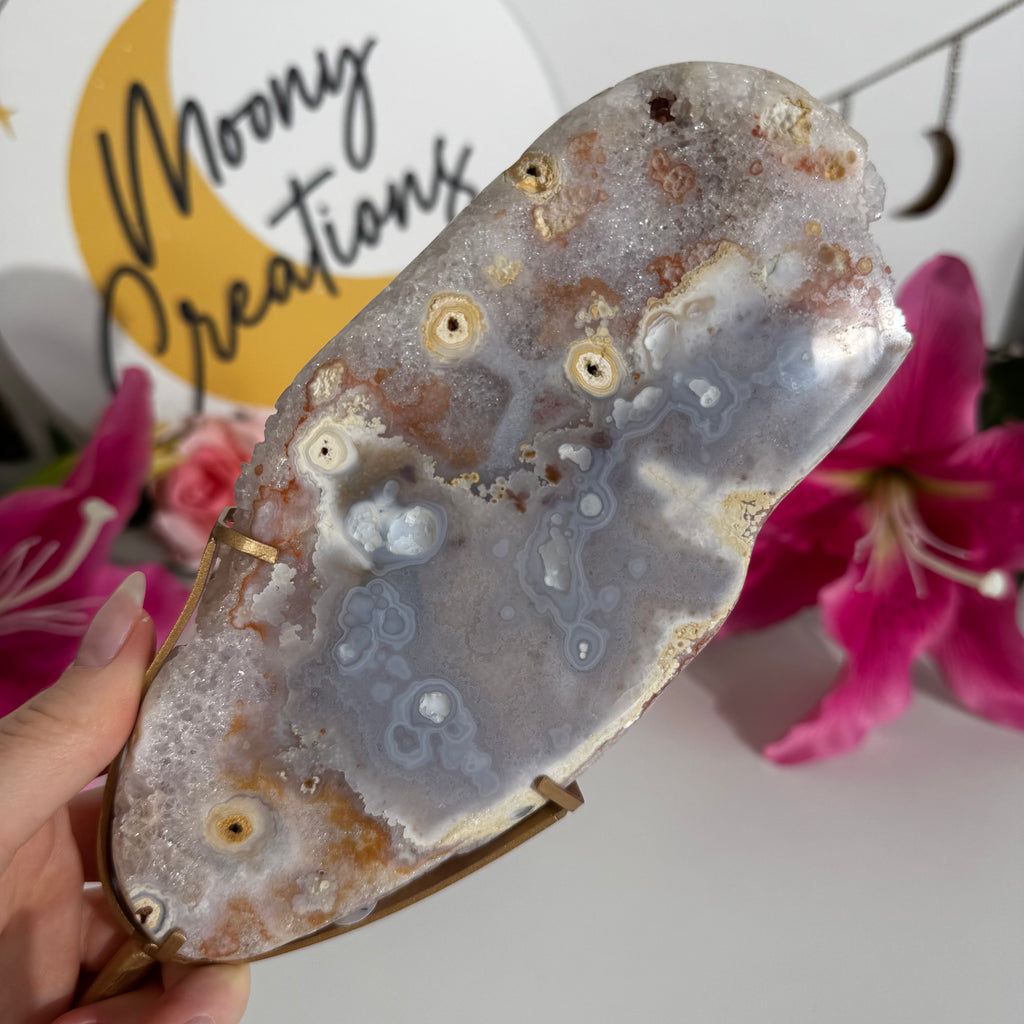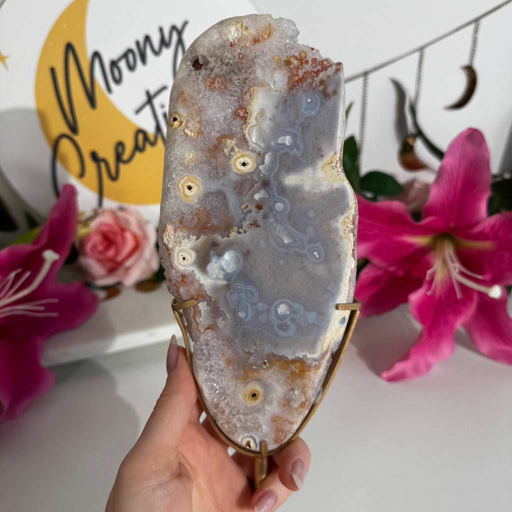 Die auffälligen runden Muster, die an Ozeanwellen oder kleine Planeten erinnern, sind sogenannte Achat-Augen. Sie entstehen, wenn sich Quarz und Chalcedon in konzentrischen Schichten um winzige Hohlräume ablagern – ein Prozess, der Millionen Jahre dauern kann. Das Innere füllt sich dann oft mit Amethystkristallen, die dem Stück seinen besonderen Glanz verleihen. Diese seltene Kombination aus Achat-Orbs und Amethystdruse macht dieses Stück zu einem faszinierenden Kunstwerk der Natur.