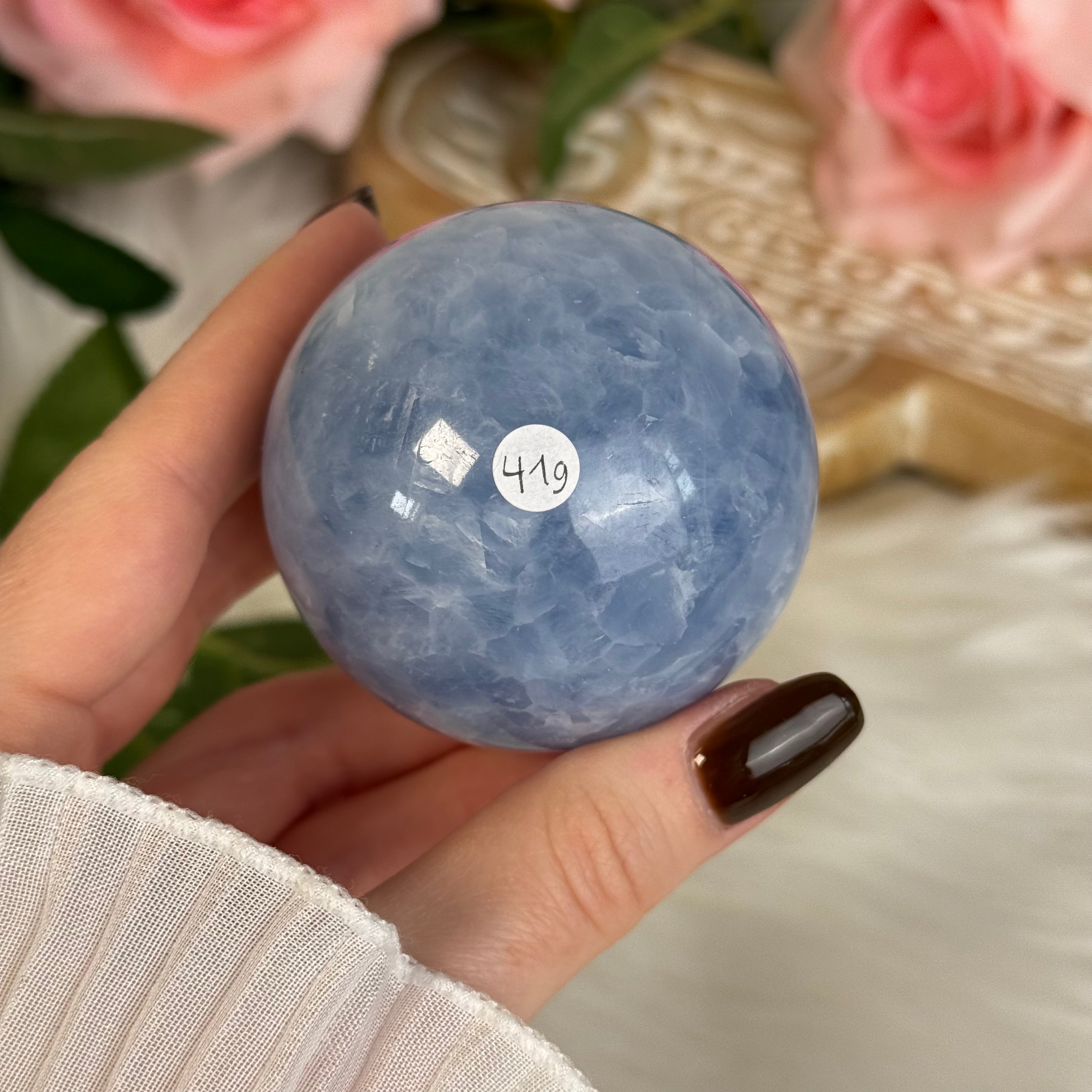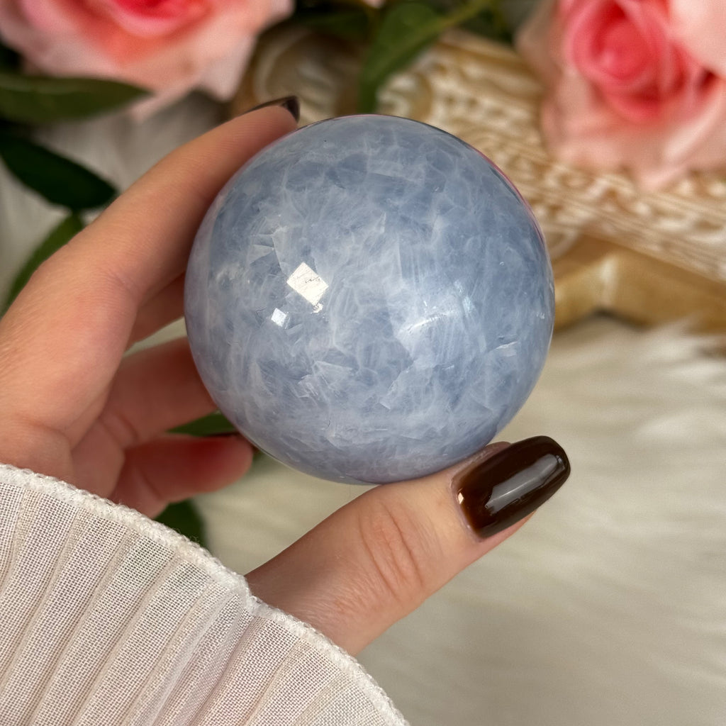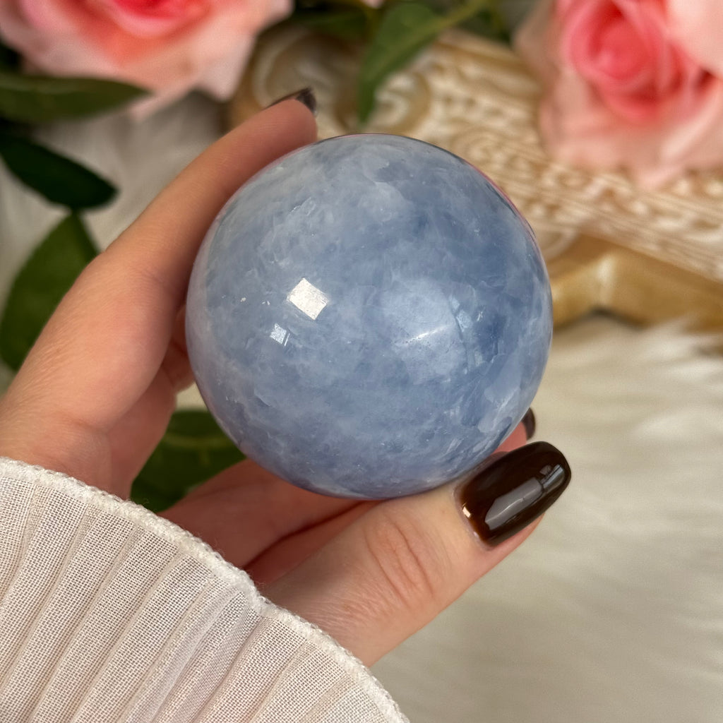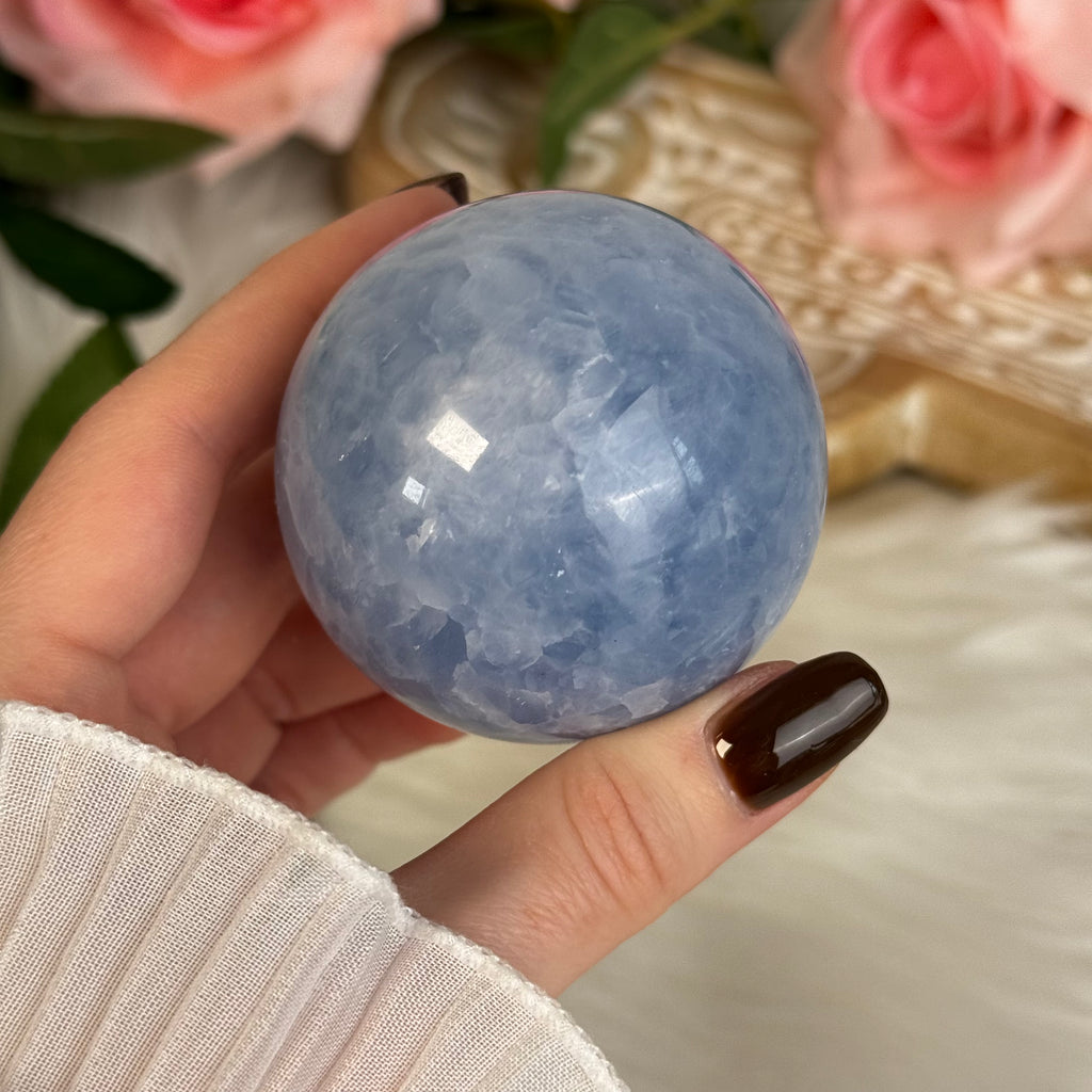 Blauer Calcit gehört zu den Calciumcarbonaten und ist deutlich weicher als viele andere gängige Kristalle (Härtegrad 3). Seine charakteristische blaue Farbe stammt von feinen Spurenelementen wie Kupfer oder natürlich eingeschlossenen Mineralfasern, die das Licht streuen und dem Stein seinen neblig-himmelblauen Schimmer verleihen.