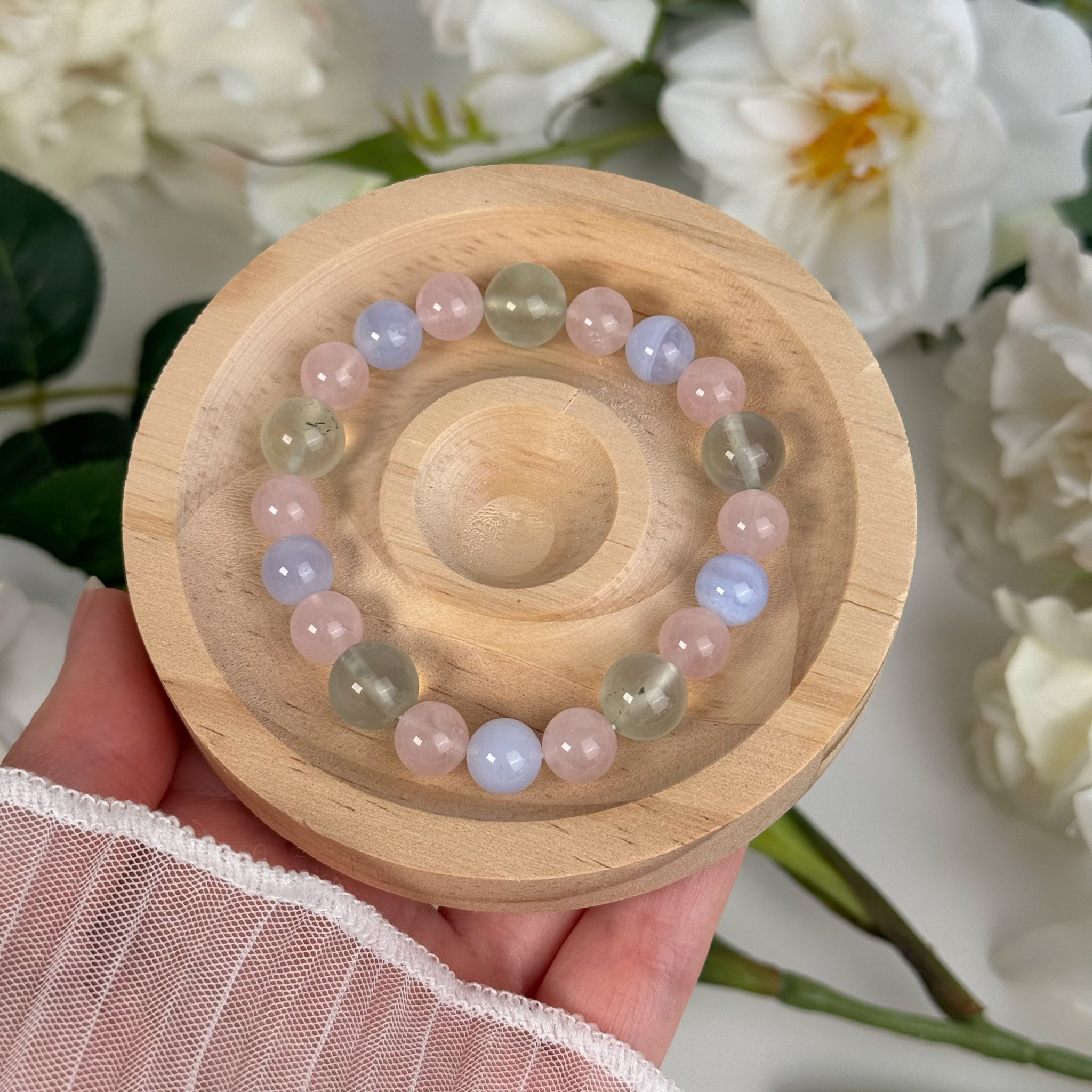 Edelsteinarmband mit Blue Lace Achat, Rosenquarz & Prehnit