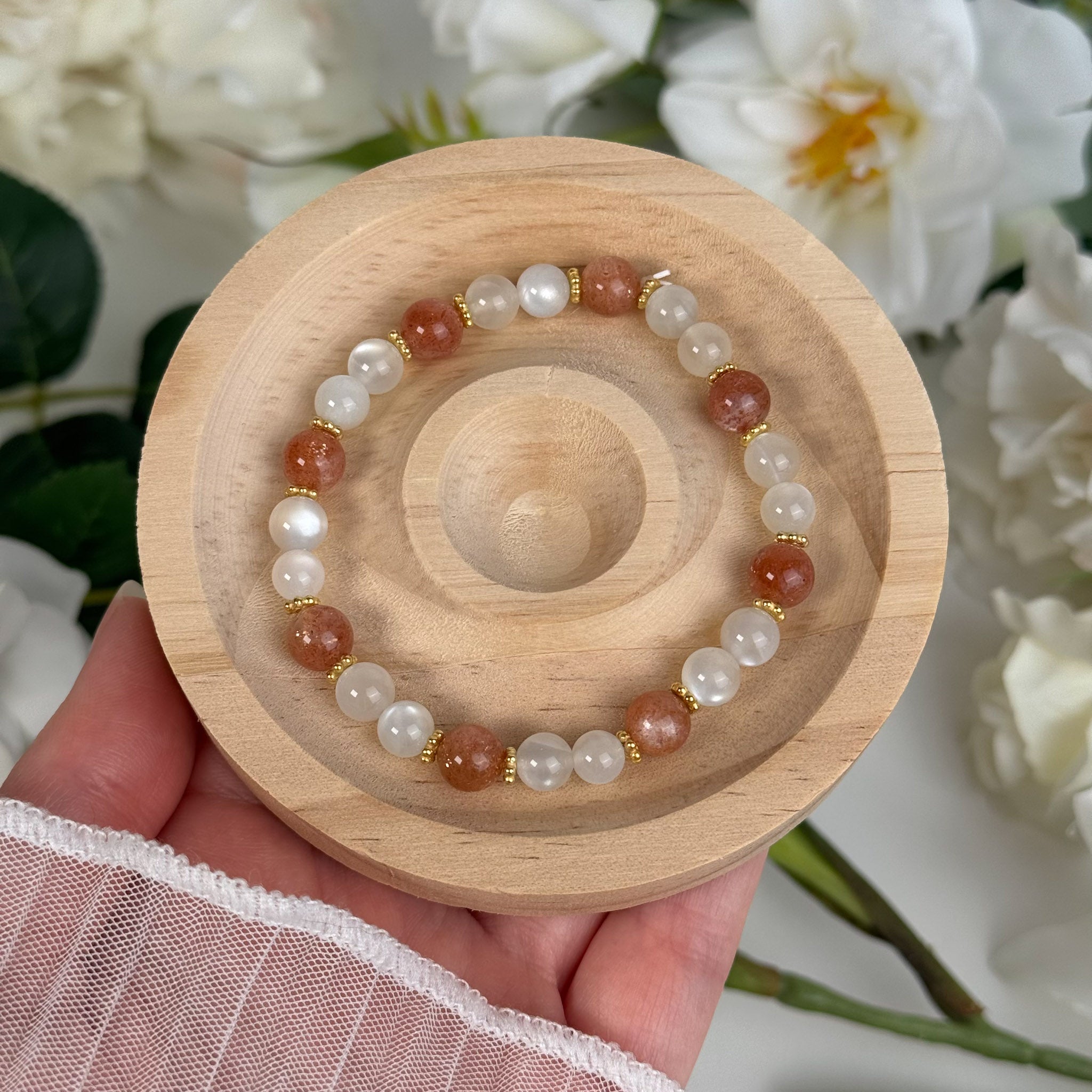 Edelsteinarmband mit weißem Mondstein & Sonnenstein