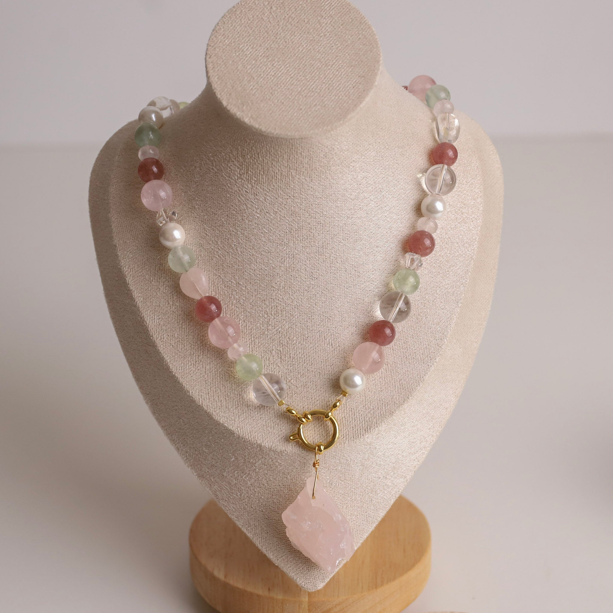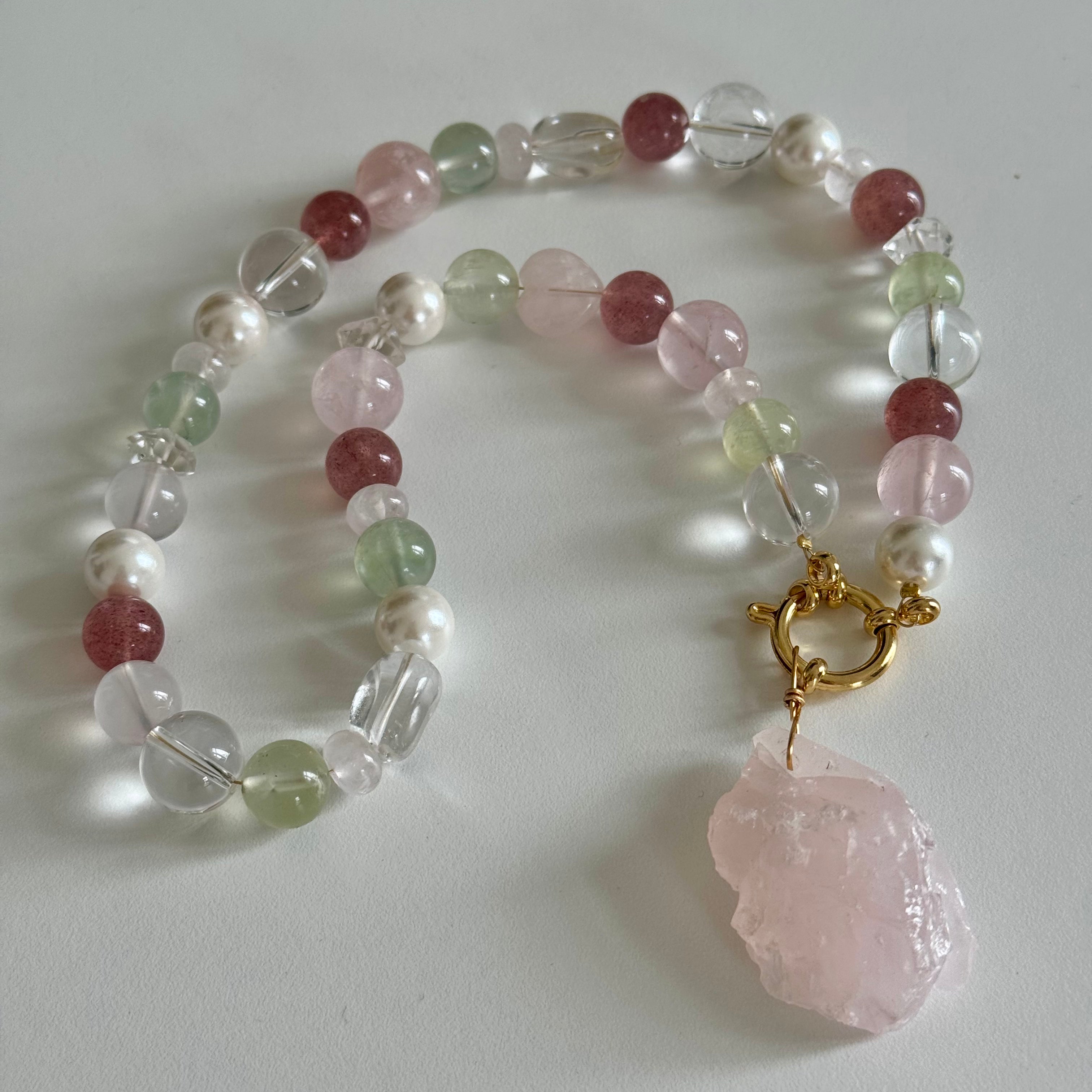Diese handgefertigte Edelsteinkette hat einen Rohstein aus Rosenquarz als Anhänger. Du kannst den Anhänger nach Belieben anbringen oder abnehmen.
