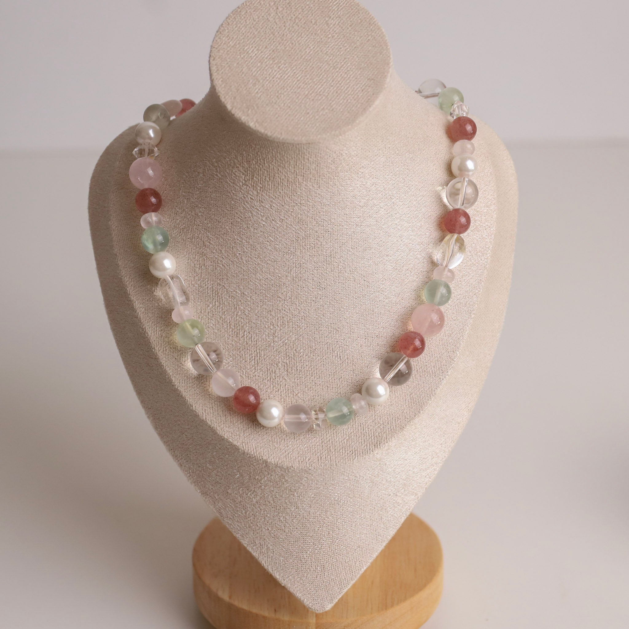 Kristalle: Rosenquarz, Bergkristall, Erdbeerquarz, Herkimer Diamant, Prehnit und Süßwasserperle